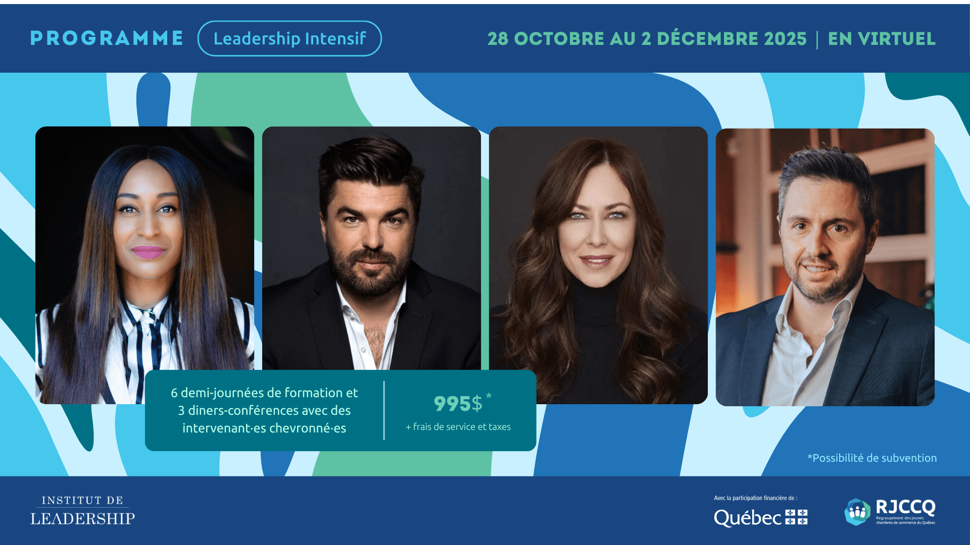 Intégrez la toute nouvelle cohorte en ligne du Programme Leadership Intensif de l’Institut de leadership, offerte par le Regroupement des jeunes chambres de commerce du Québec.